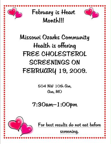 Missouri Ozarks Community Health is offering FREE Cholesterol screening on February 19th, 2009 at their Ava office located at 504 NW 10th Ave, Ava.